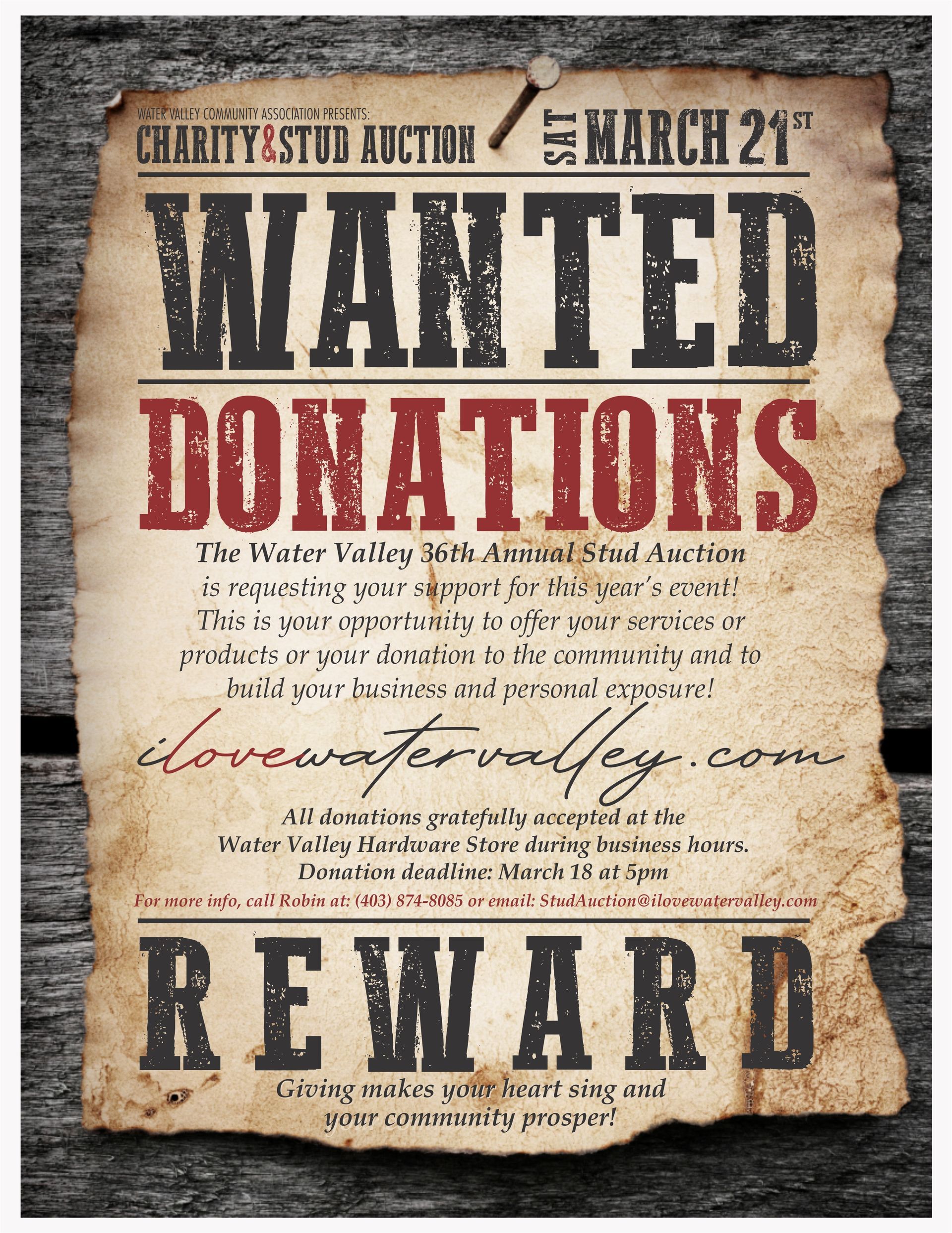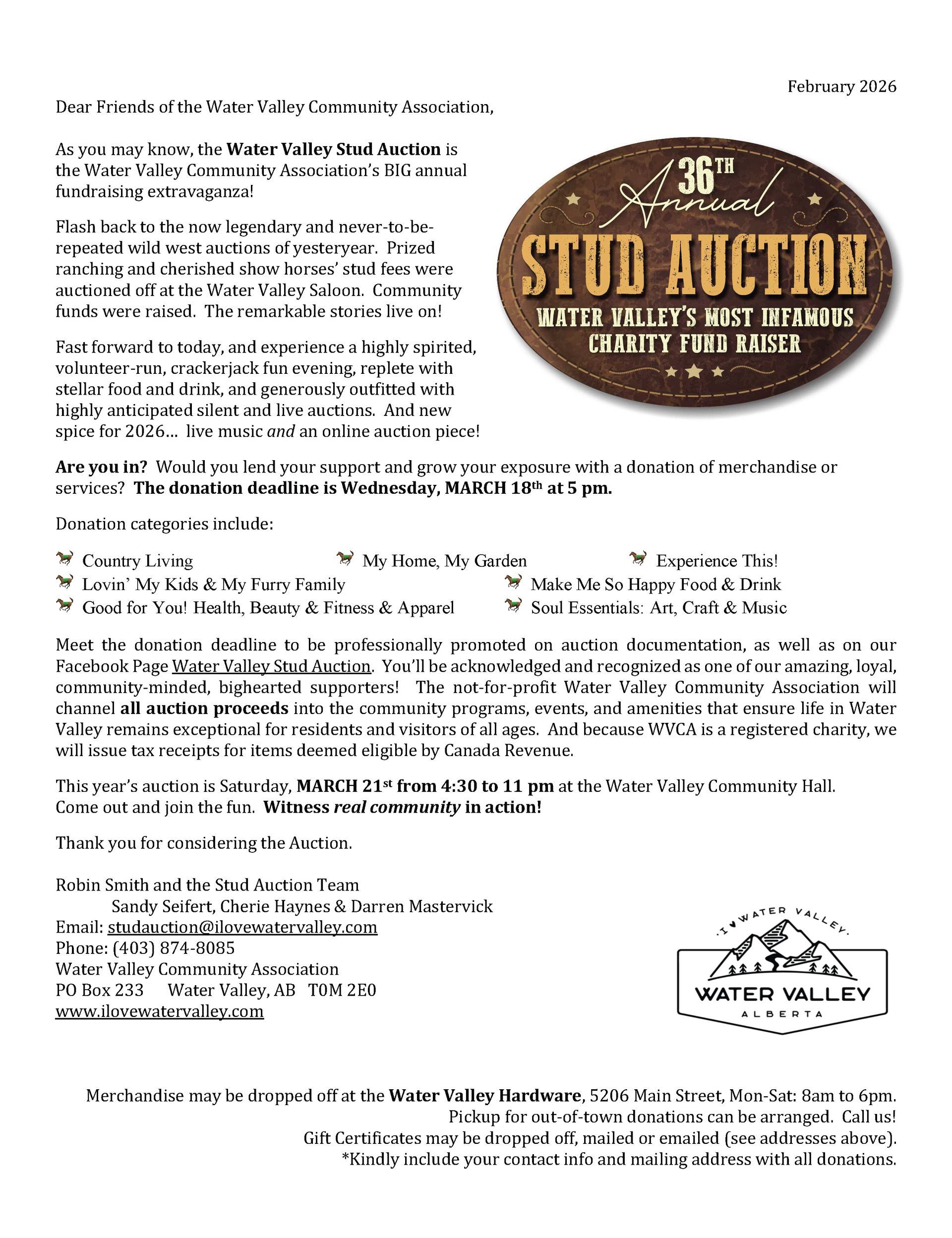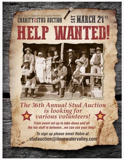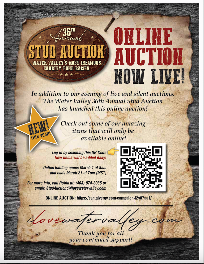 Fast forward thirty plus years. No we can’t hold a candle to that Stud Auction legacy of yesteryear, but what we can offer is this. An incredible night of auction, both silent and live, outfitted through the amazing and generous donations of local individuals and businesses. Fire-cracker auctioneers that set the house on fire! Good food, good drink, good fun. All volunteer run at the new Water Valley Hall. And all proceeds to the WVCA, to make life better for all who call Water Valley and surrounding area home.